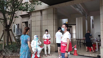 集團(tuán)公司總部機(jī)關(guān)黨員任賢亮(右一)參加社區(qū)抗疫志愿服務(wù)
