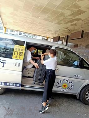 順慶分公司定制客運(yùn)班長、駕駛員曾慧在抗疫轉(zhuǎn)運(yùn)離港人員中,為旅客幫提行李箱。