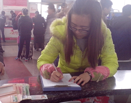 旅客黃鳳英在認(rèn)領(lǐng)登記掛包丟失的物品