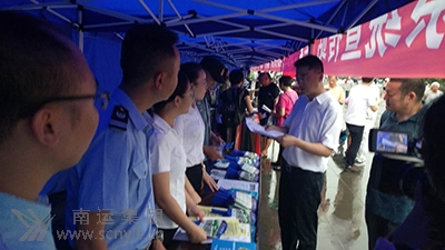 西充縣委常委、常務副縣長龐亮(右二)到現(xiàn)場查看宣傳資料